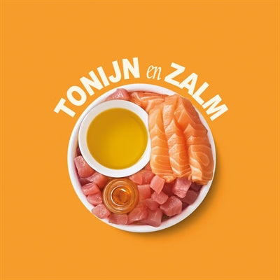 Vers bereide tonijn (47%), vers bereide zalm 4%, tonijnbouillon (47%), zonnebloemolie, mineralen, tapioca, tonijnolie.