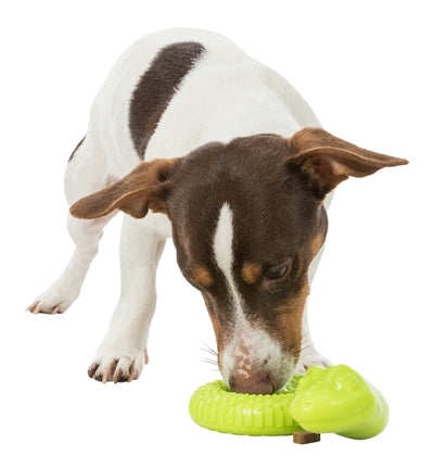 Met deze leuke Snack-slang van Trixie ga je verveling tegen door jouw hond spelenderwijs te belonen. Deze vrolijke snack-slang is gemaakt van thermoplastisch rubber en is open aan de onderzijde. In deze spleetvormige opening kun je verschillende soorten voer of snacks stoppen, zodat de hond spelenderwijs bezig is zijn beloning te krijgen. Door de smalle opening is de slang ook geschikt voor bijvoorbeeld leverworst: de hond is lang bezig alle paté uit de opening te likken. Zo blijft jouw hond lekker bezig, ook als jij er niet bent, en ga je verveling tegen.